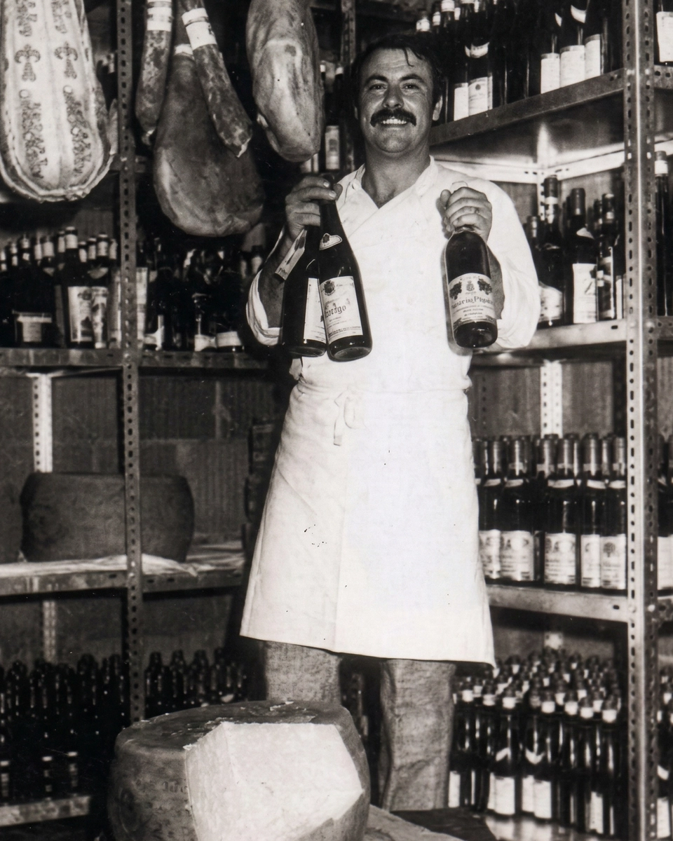 Foto storica di Luigi Brunetti nel suo ristorante in Germania, circondato da bottiglie di vino, salumi e formaggi, simbolo dell'autentica eccellenza gastronomica italiana.